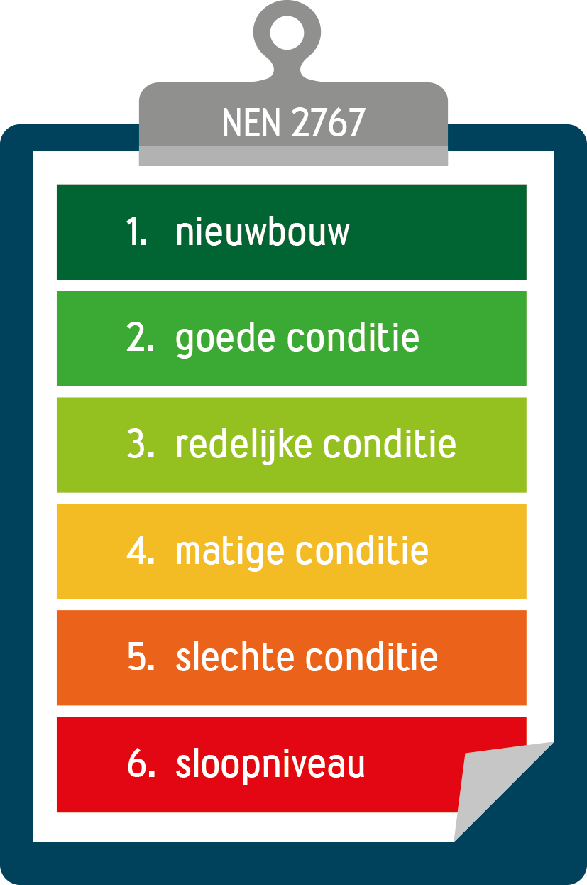 We maken het meerjarenonderhoudsplan met behulp van de NEN 2767. Dit is een norm voor het uniform inspecteren en in kaart brengen van de technische staat van alle bouw- en installatiedelen van gebouwen en infrastructuur. Met behulp van conditiescores kunnen we inzicht geven in onderhoudskosten en mogelijke risico’s. Die scores gebruiken we vervolgens om het meerjarenonderhoudsplan op te stellen.